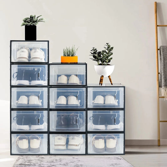 X-Large Shoe Storage Boxes Organizers Clear Plastic Stackable 12 Pack, Shoe Rack & Holder Substitute, Sneaker Containers, Toy Storage Organizer Bins for Entryway, Closet, under Bed, Black